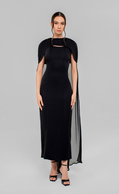 فستان راقٍ بلمسة خالدة يتميّز بقصّته الانسيابية الأنيقة وتفاصيل الكاب الفاخرة. صُمم بقصّة مشدودة على الخصر وانسياب ناعم يمنح إطلالة أنثوية راقية تجمع بين العصرية والكلاسيكية. متوفر باللون الأسود لإطلالة مسائية جريئة، أو باللون العاجي لأسلوب راقٍ وبسيط، ليمنحك هذا التصميم حضوراً أنيقاً واثقاً في كل مناسبة.
