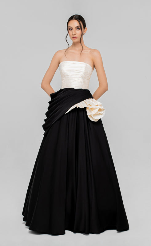 مصنوع من ساتان لامع وشبك مطرّز بخفة، بتصميم مكشوف الأكتاف يمنحك أناقة تنساب دون أي مجهود. ويتحرك القماش خلفك بانسياب مع كل خطوة ليخلق إحساسًا حلميًا يعكس رُقيًّا خالصًا.