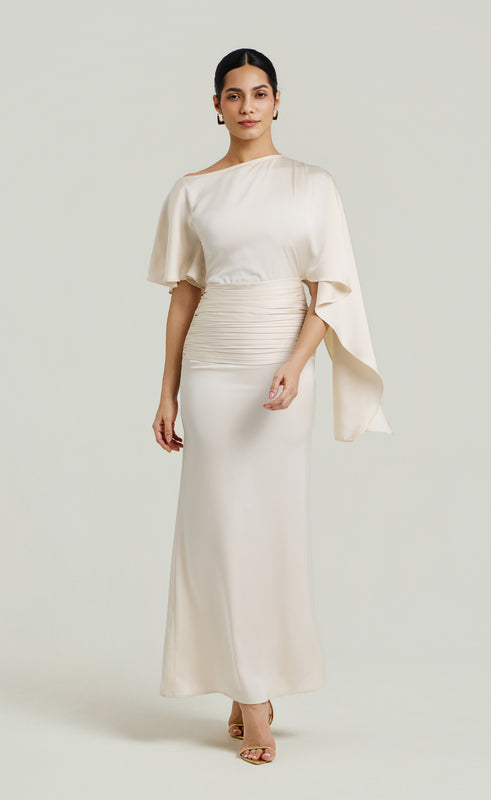 يجمع هذا الفستان بين البساطة والفخامة بأسلوب راقٍ. مصنوع من ساتان تويل فاخر، ينسدل على الجسم ليمنح إطلالة متقنة وأنيقة. يتميز بصدّة مطوية ناعمة، كم كاب غير متماثل، وخط خصر مطوي ليبرز القوام بشكل جميل، بينما تضفي التنورة النظيفة لمسة من الأناقة الخالدة. مثالي للنساء اللواتي يقدّرن السحر الراقي والبساطة الراقية، حيث يمنح الفستان حضوراً مميزاً وجاذبية عصرية.