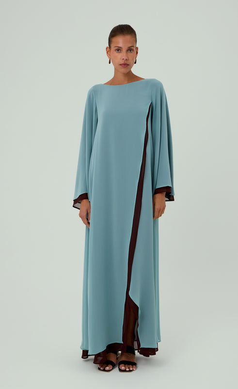 A striking balance of simplicity and artistic flair, this kaftan is designed to make an impression. The wide, draped sleeves and relaxed silhouette offer effortless elegance, while the asymmetric front opening and two tone add depth and contrast. Crafted from fluid fabric that moves gracefully, this dress is ideal for formal occasions, cultural events, or refined eveningwear with a contemporary twist.
