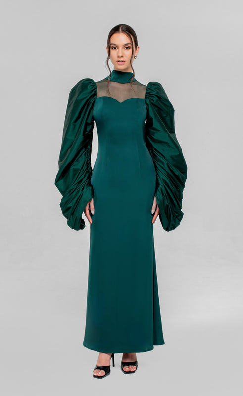 This evening gown redefines dramatic elegance with its sculptural silhouette and rich mix of fabrics that create depth, texture, and movement. The voluminous statement sleeves add architectural beauty and balance, while the design enhances the body’s natural form. Perfect for special occasions, this gown is made for women who want to command attention with timeless sophistication.