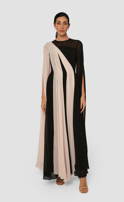 Immerse yourself in a cascade of warmth and elegance with the Basma dress, a captivating creation crafted from two tone draped chiffon. With its harmonious blend of hues and flowing silhouette, this dress turns every occasion into a stunning tapestry of style and grace.