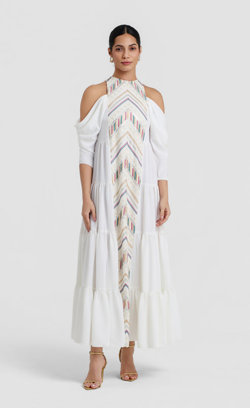 The Fajer dress beautifully intertwines elegance and artistry. Crafted from thread-embroidered with a linen-blend fabric, it features dramatic sleeves and a flowing silhouette that exudes sophistication, making it ideal for captivating evenings of celebration.