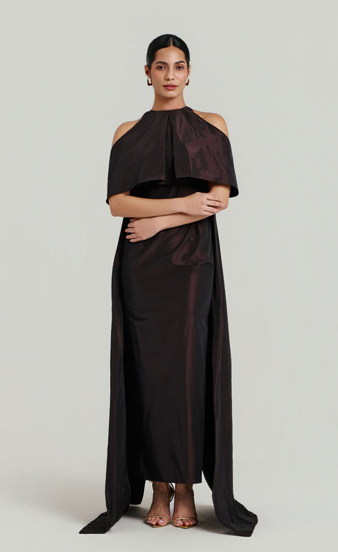 Hawa dazzles in reflective taffeta, cut to a fitted silhouette with a center back slit. A ruffled overlay frames cold-shoulder openings while back panels add modern edge a piece built for luminous impact.