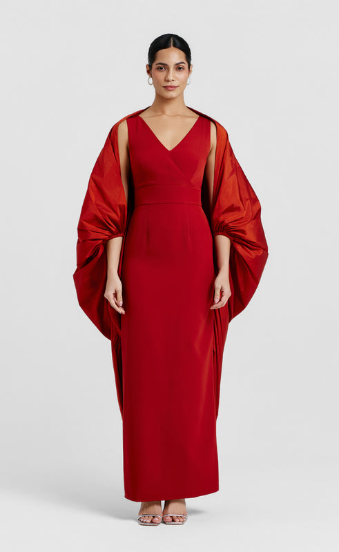 This avant-garde gown is a stunning blend of modern design and elegance. Made from sleek, form-fitting crepe, it features a sculpted V-neckline that elongates the silhouette, while a voluminous cape drapes from the shoulders, adding dramatic movement. The contrast between the gown’s streamlined shape and the flowing cape creates a powerful, graceful presence, perfect for a woman who commands attention at every event.