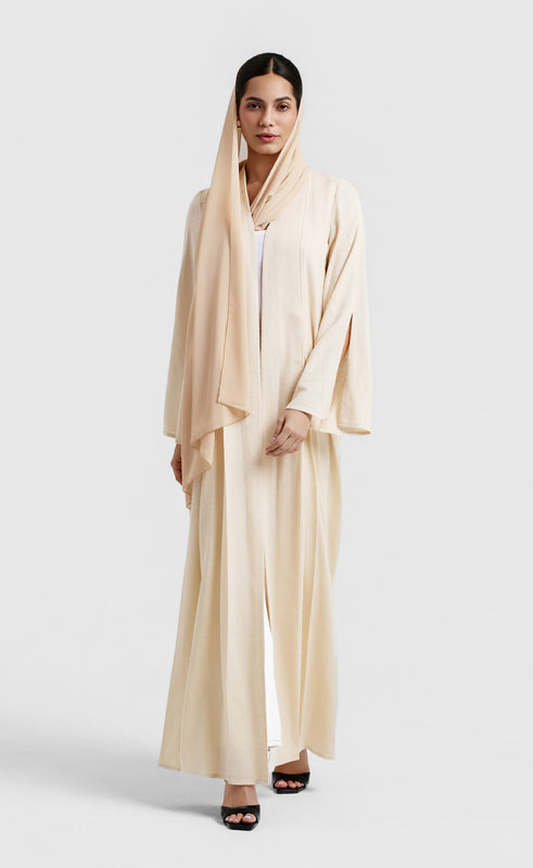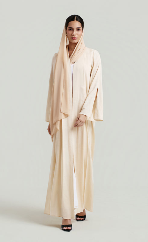 This cotton abaya offers a beautiful blend of modern simplicity and luxurious comfort. It features full sleeves for modesty and a sleek, elegant design. The fabric has a smooth, lustrous feel, making it a versatile and effortless wardrobe essential. It's available in two colors: olive green and cream.
