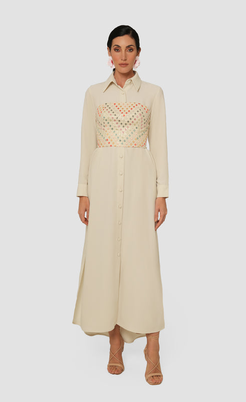 The Lamis Dress a pristine cream shirt dress that effortlessly combines sophistication and charm. It features fabric-covered buttons and a refined silhouette. The dress comes with a stunning multi-color embroidered corset that can be worn with or without the dress, offering versatile styling options. Perfect for various occasions, the Lamis Dress is an elegant choice that celebrates timeless beauty and individuality.