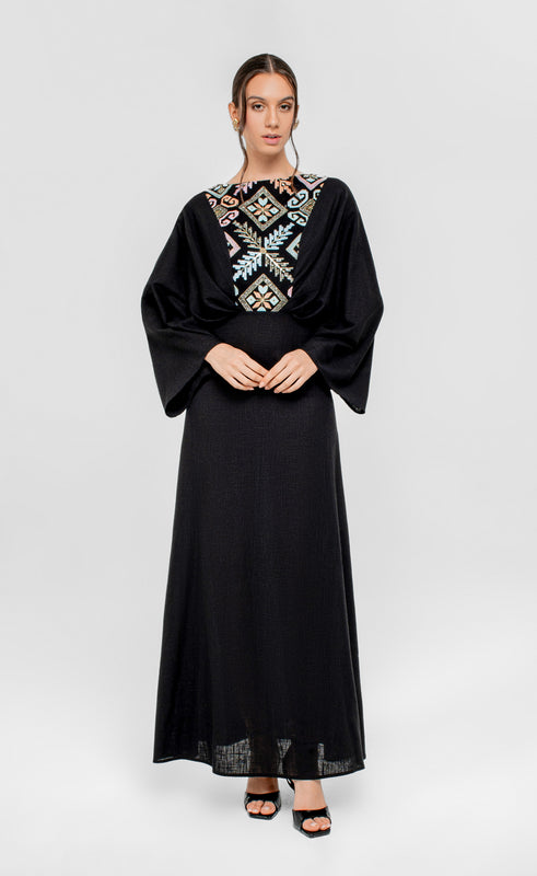 An exquisite floor-length kaftan in black and off-white, designed with contrasting textures for added depth. Featuring a smooth, fluid drape, it is highlighted by a front yoke and wide kimono sleeves that create graceful movement. Clean lines and a lightweight feel give the piece a modern yet timeless elegance.