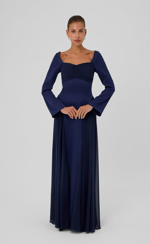 Command attention in this striking dress, designed with a romantic sweetheart neckline and elegantly draped bust. The long, flared sleeves balance the fitted bodice, while the voluminous skirt flows with effortless grace. Side gathers and panel details add depth and movement, creating a flattering silhouette from every angle. Ideal for evening affairs and formal occasions, this piece radiates timeless sophistication and modern femininity.