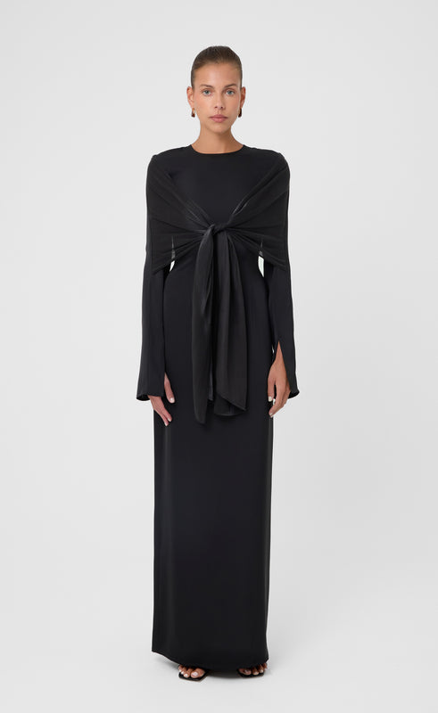 Turn heads in this sophisticated black maxi dress, designed to embody timeless elegance with a modern twist. Featuring a full-length silhouette, this dress is crafted from a sleek, form-skimming fabric that offers both comfort and understated glamour. The standout feature is a dramatic sheer overlay that ties into a bold, statement bow at the front, adding a layer of texture and artistry to the minimalist design. Long sleeves and a high neckline provide a balanced, refined look—ideal for formal events, galas, or an upscale evening out.