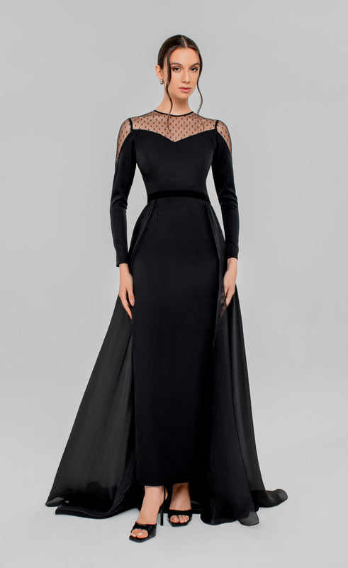 The Abir Dress 2.0 features luxurious crepe and polka-dot powermesh, complemented by a bias-cut organza overlay and a chic velvet belt. Designed with refined textures and graceful movement, this elevated version of a signature silhouette is sure to captivate at any upscale gathering.