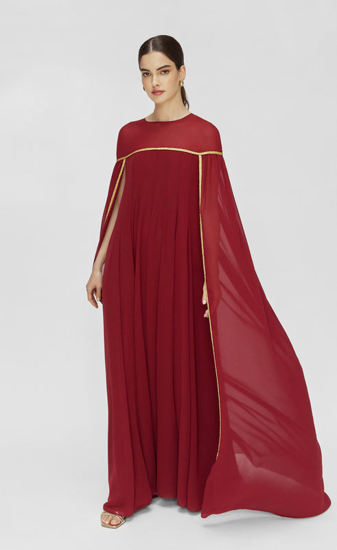 Immerse yourself in our floor-length chiffon kaftan, featuring nine flowing panels for a graceful silhouette. The translucent top panel, adorned with a draped cape and metallic trim, adds sophistication. Embrace the blend of style and grace with this captivating kaftan, perfect for any special occasion.