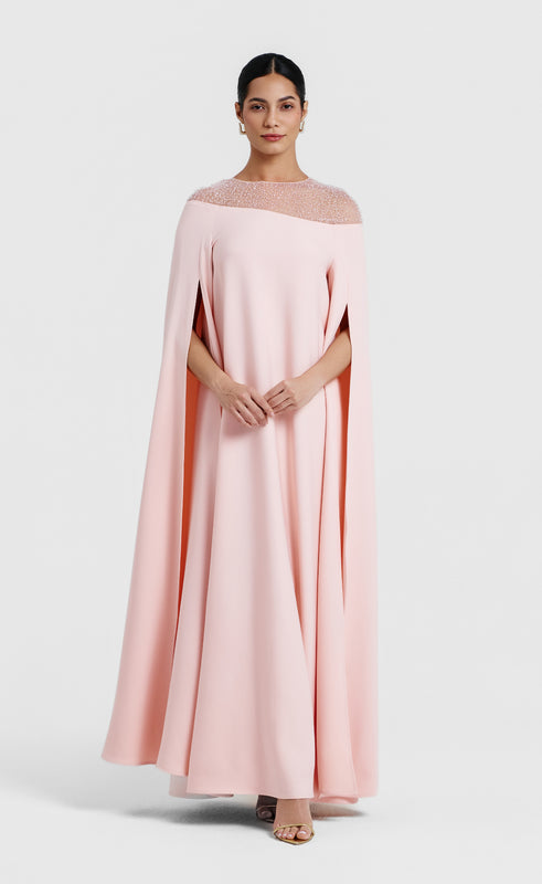 An elegant peachy-pink kaftan crafted from fluid crepe, designed with a graceful A-line silhouette and floor-length cape sleeves for effortless movement. Delicate mesh shoulders adorned with intricate beadwork and subtle shimmer add a refined touch of glamour.
