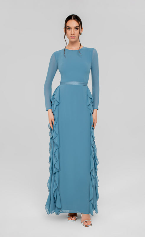 The Rinad dress exudes effortless elegance, crafted in lined chiffon with ruffles cascading from the hip to the floor. A defined waistband shapes the silhouette, balancing airy movement with structured refinement, ideal for formal gatherings and graceful entrances.