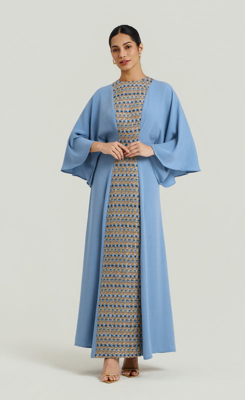 A floor-length kaftan crafted from a textured tweed and cotton blend, offering refined comfort and structure. Designed in classic navy and blue tones, it features wide kimono sleeves and a central panel highlighted with warm-toned multicolored embroidery for a timeless, elegant finish.
