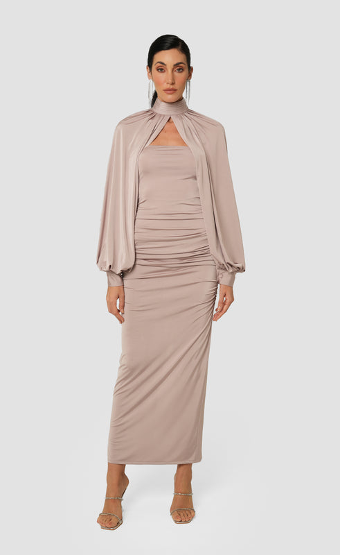 Introducing the Sienna Dress – a ruched, body-hugging nude jersey masterpiece designed to sculpt and flatter your figure. With its carefully placed ruching and curve-enhancing fit, this dress offers a sleek, sophisticated look that’s both daring and elegant.