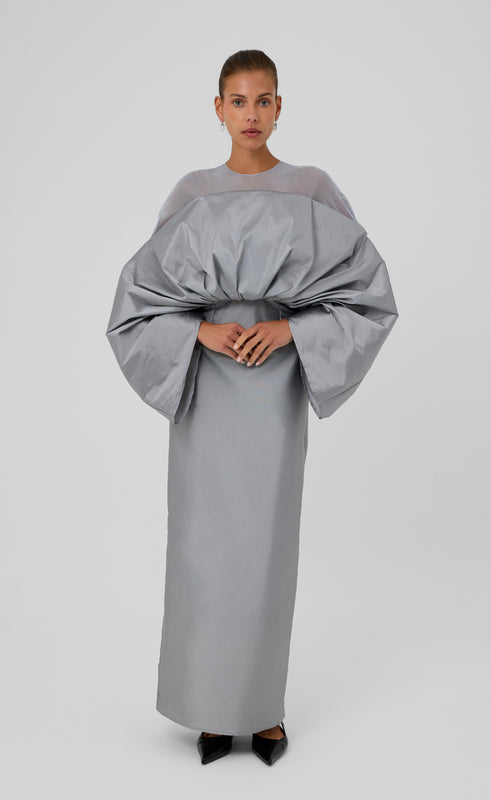 Make a daring entrance in this avant-garde maxi dress, expertly crafted to blend bold structure with refined elegance. The voluminous, origami-style draped bow detail at the front creates a dramatic silhouette, drawing all eyes to the waistline while maintaining a sleek column shape. A sheer mesh upper bodice adds contrast and intrigue, offering a modern play on textures. Perfect for fashion-forward formal occasions, red carpet events, or editorial moments.