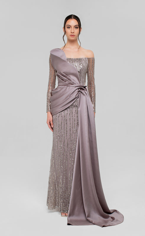 Grace the evening with timeless tranquility in the Liora Dress. Draped in luminous satin and delicately embroidered mesh, this off-shoulder silhouette embodies effortless poise. The cascading fabric glides behind with every step, creating a dreamlike motion that defines pure sophistication.
