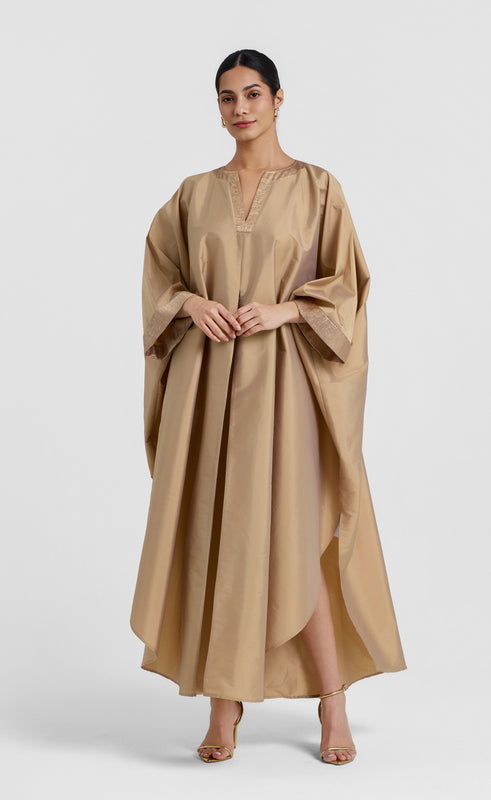 An elegant kaftan crafted from luxurious taffeta, highlighted with crushed foil borders that catch the light beautifully. Designed with a relaxed silhouette and side slits for effortless movement, it balances comfort with statement glamour. Available in classic navy blue and radiant gold.