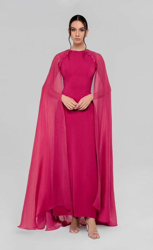 Exude ethereal elegance in this stunning champagne beige satin dress, designed with a regal silhouette and fluid movement. The sleek, body-skimming design is accentuated by a floor-length sheer cape overlay that cascades from the shoulders, creating a sense of drama and sophistication. Subtle button detailing adds a vintage-inspired touch, while the high neckline keeps the look polished and poised. Perfect for formal galas, red carpet events, or high-fashion evenings.